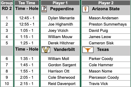 Vanderbilt and Texas will meet up in the semifinal round, this evening. The semifinal matches are set to begin 3:45 p.m. ET with the first groups going out for Pepperdine and Arizona State. The first group for Texas and Vanderbilt will tee off at 4:35 p.m. ET.