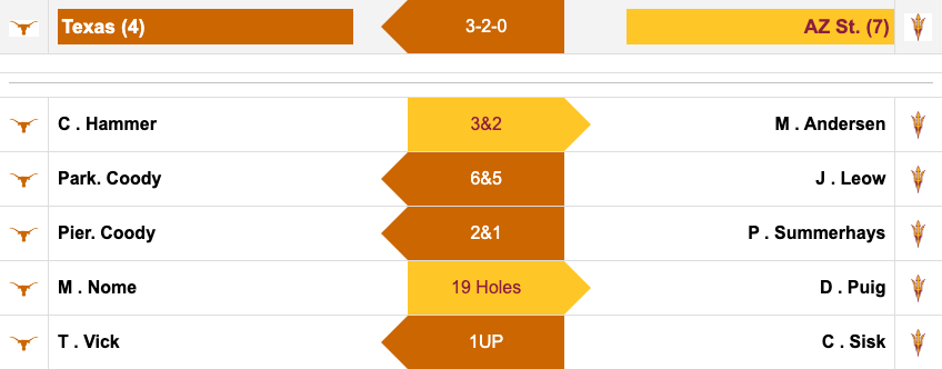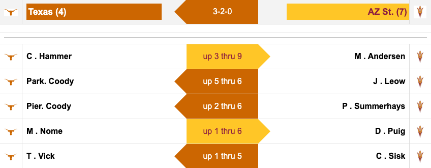 Texas holds the lead in one match that is currently in play. Pierceson Coody is up two through 12 over Preston Summerhays. Arizona State does have the chance to get a point with Mason Andersen up three through 15 over Cole Hammer. The matches between Nome-Puig and Vick-Sisk are both tied.