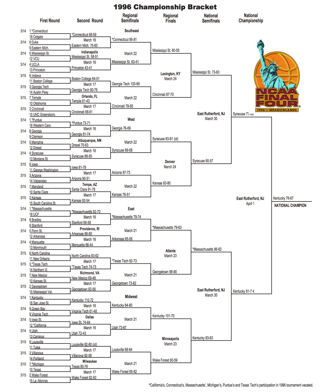 The 1996 NCAA tournament saw Kentucky march to the national title with a win against Syracuse in the final. The Wildcats won their games by 38, 24, 31, 20, 7 and 9 points. Get the 1996 March Madness bracket, scores and what you need to know below.