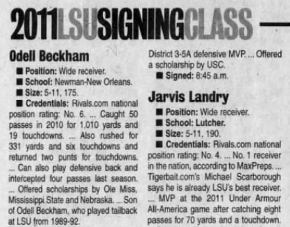 Miles, during camp of Beckham's freshman year (from The Daily Advertiser): "My impressions of Jarvis and Odell Beckham are they are guys that are going to play in games really right away. I think they're competitive physically. I think they're competitive mentally, and they have skills. And I think we have a good freshman class, but I think that those two guys by need will step onto the field. And they won't play like freshmen. They'll play very competitively and big physically, and look for big plays out of them."