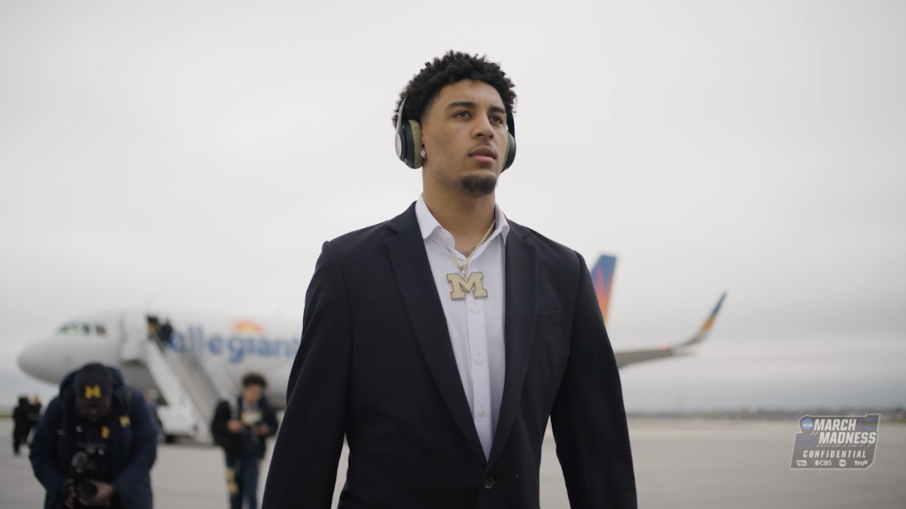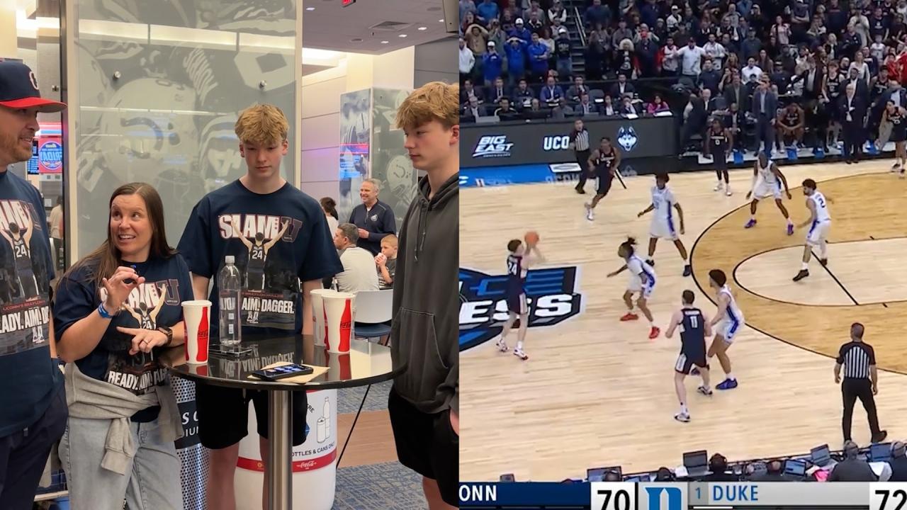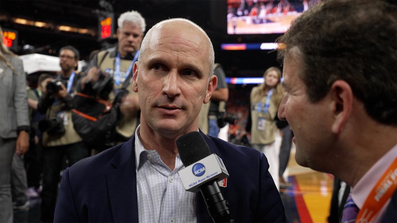 Andy Katz talks with Husky head coach Dan Hurley after Final Four victory