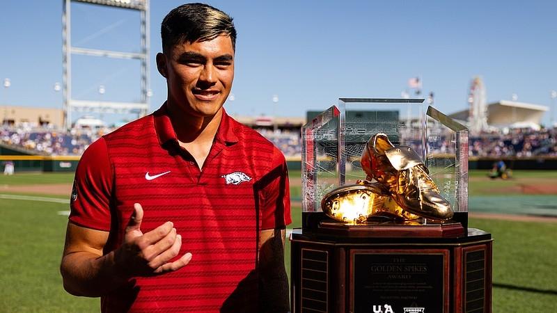 Arkansas' Wehiwa Aloy won the 47th Golden Spikes Award, presented by USA Baseball, ahead of Game 1 of the 2025 Men's College World Series finals on Saturday, June 21. Aloy is the third Razorback to win the award.