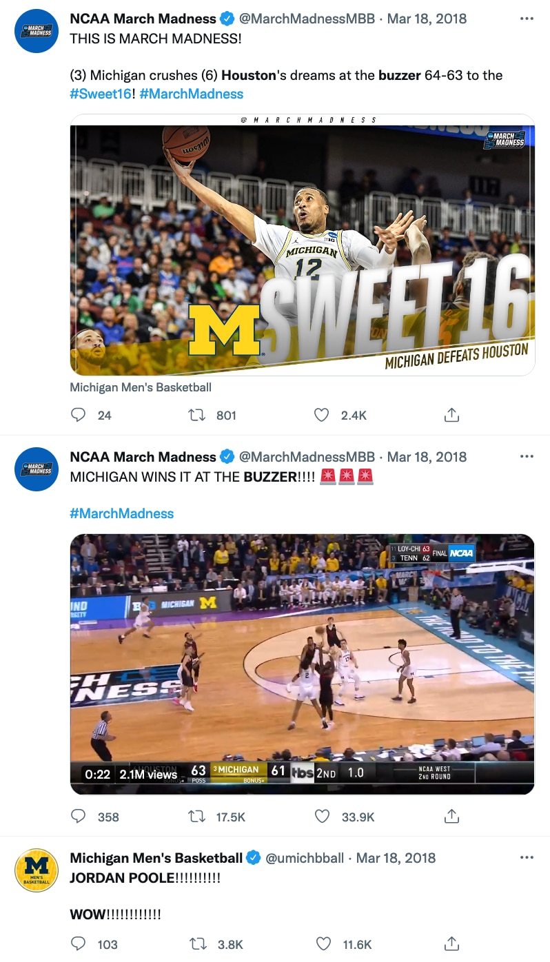 That was CBS' Brad Nessler's call of Michigan guard Jordan Poole's game-winning buzzer-beater over No. 6 seed Houston in the second round of the 2018 NCAA tournament — tied for the fifth-longest game-winning buzzer beater in the history of the NCAA men's basketball tournament — Michigan's 11th win in a row, en route to the Wolverines' eventual run to the national championship game for the second time in six seasons.