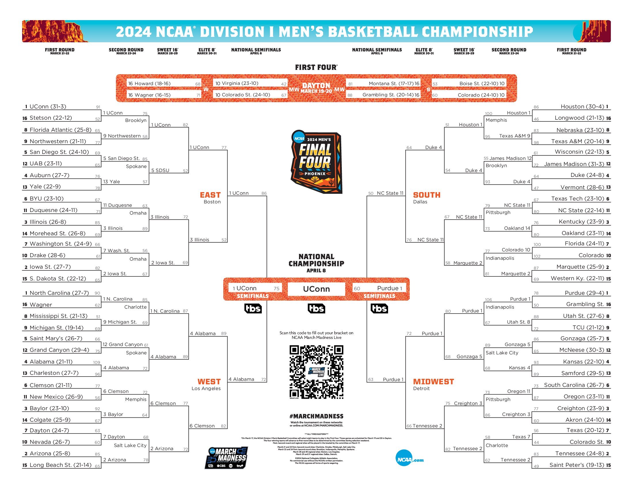 2024 NCAA bracket: Scores, stats, for March Madness men’s tournament