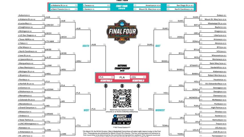 Here is the final 2025 NCAA bracket for the March Madness men's tournament, along with the scores and stats for all games.