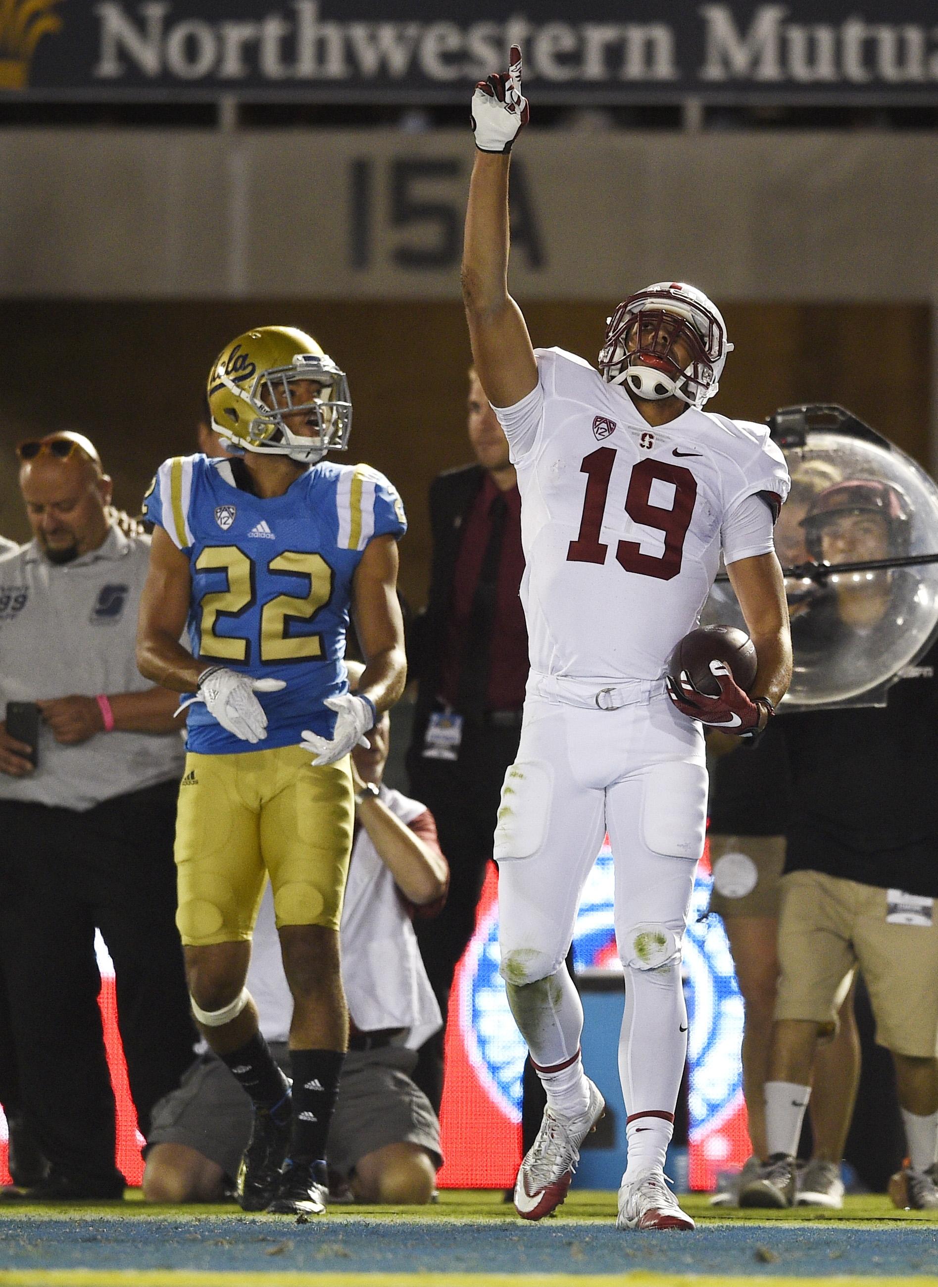 Arcega-Whiteside jostled for position with Bruins defensive back Nate Meadors before winning the jump ball and landing with one foot inbounds. The touchdown was the deciding score as Stanford rallied to win 22-13 (a Stanford fumble recovery for a touchdown on UCLA’s last-ditch next drive put the finishing touches on the comeback).