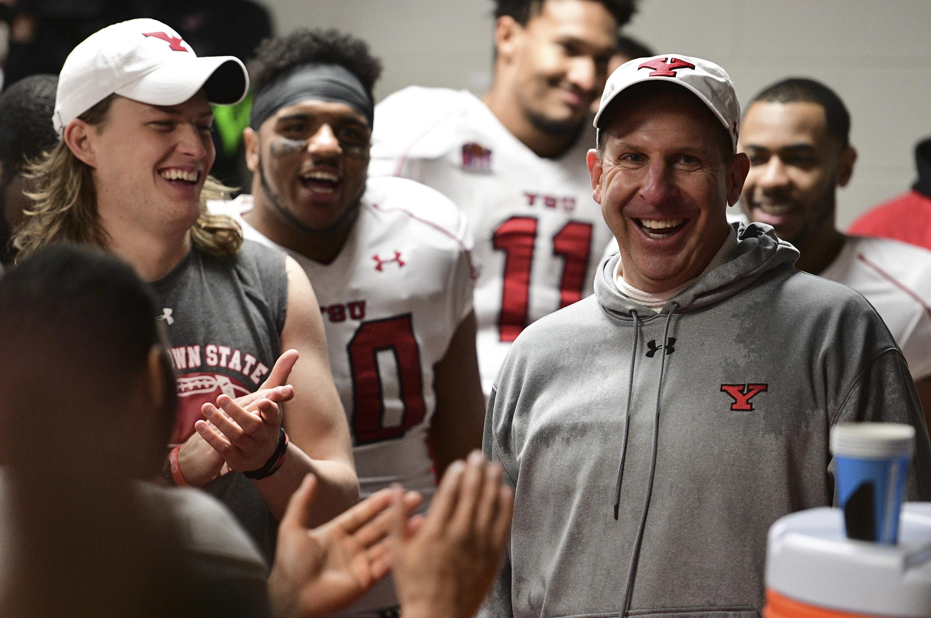 YSU head coach Bo Pelini smiles after the Penguins' upset win against Jacksonville State.