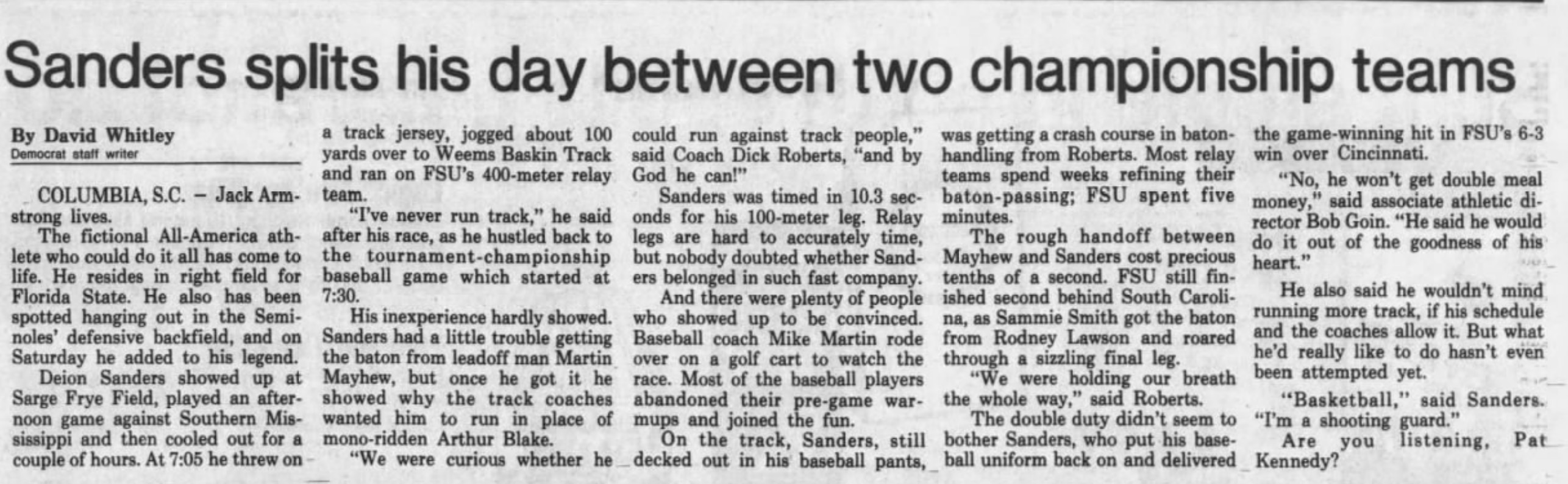 "Deion Sanders showed up at Sarge Frye Field, played an afternoon game against Southern Mississippi and then cooled out for a couple of hours. At 7:05 he threw on a track jersey, jogged about 100 yards over to Weems Baskin Track and ran on FSU's 400-meter relay team.