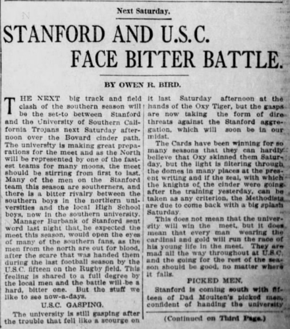 "The next big track and field clash of the southern season will be the set-to between Stanford and the University of Southern California Trojans next Saturday afternoon over the Bovard cinder path," Bird wrote.