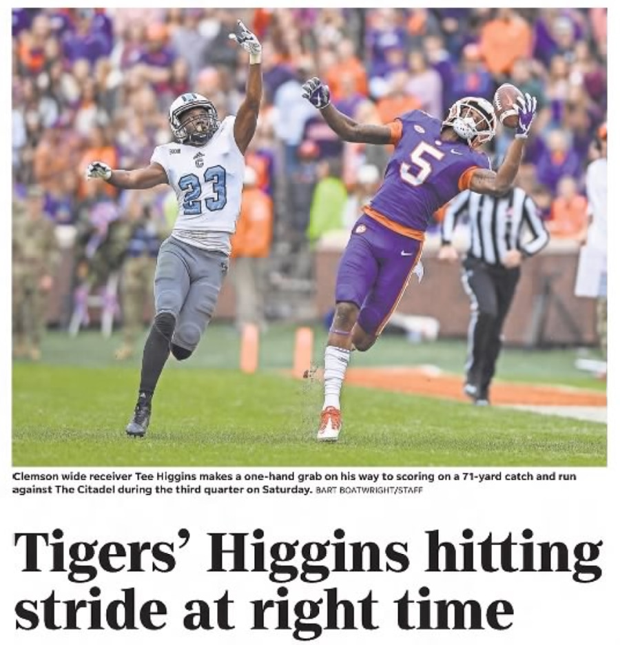 "Clemson went to Tennessee and beat out the Vols for the No. 2 receiver in the country," reported The State (above) on National Signing Day in February 2017. "Higgins is 6-foot-4 with impressive hands and will provide a big target for whoever the Tigers' quarterback is."