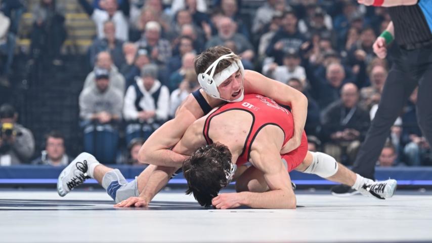 No. 2 Bella Mir of North Central set the crowd on notice when she upset No. 1 Reese Larramendy of Iowa with a fall in a rematch of last year’s championship bout. After finishing as runner-up in 2025, Mir claimed her first national title against her former teammate and ended Larramendy’s 35-match undefeated season.